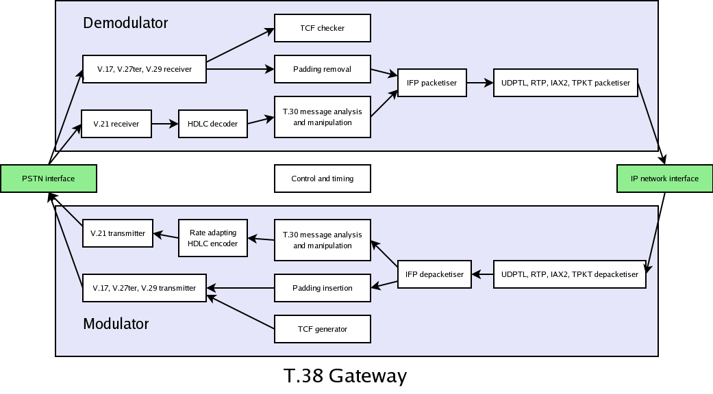 If the HDLC decoder in a T.38 gateway worked in whole frames, it would introduce unacceptable latency. Instead, the HDLC decoder must work progressively through the HDLC frames, outputing its results octet by octet. The T.38 message stream does not contain HDLC preamble, though it usually contains an indication that preamble is in progress. It does not contain the CRC octets, but simply an indication of whether the CRC is good or bad. The HDLC decoder provides an indication when preamble is being received, and checks the CRC octets at the end of frames to provide the good or bad indication. The decoder makes the frames available, octet by octet, to the T.38 engine for status tracking and possible modification. Tracking and modification imposes a few octets delay, but the goal is to keep this to the minimum possible. Whether the frames are modified or unmodified, good or bad they are always passed on, to maintain the appropriate timing flow for the T.30 protocol.